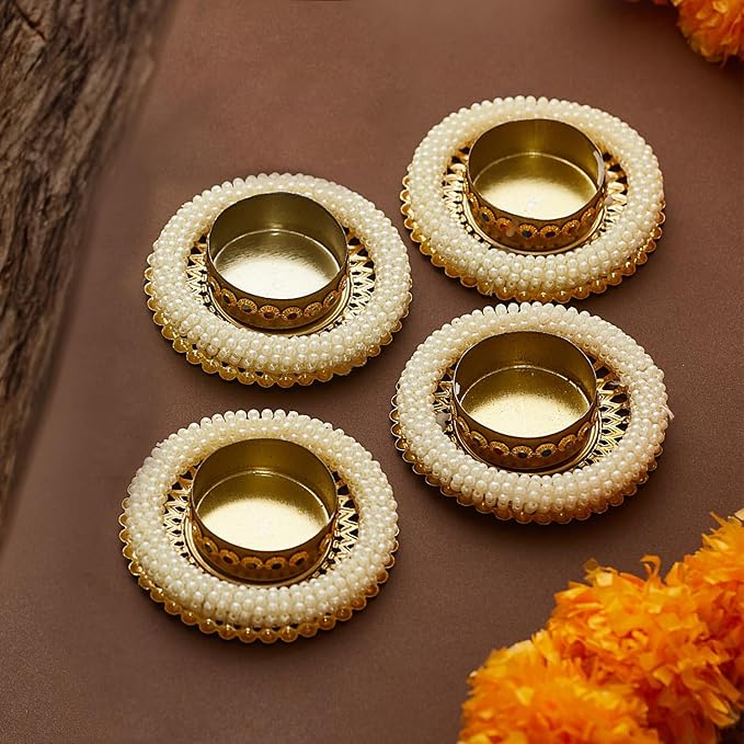 Tied Ribbons 4 Pcs Handmade Tealight Candle Holder for Pooja and Home Decoration | Mandir, Temple | Diwali Decorations, Gifts | Indian Decorations